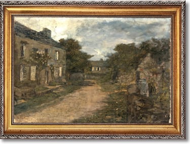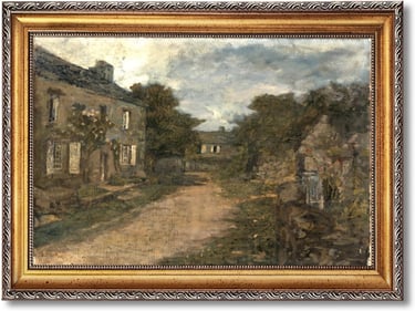 This artwork captures an old European village street with stone buildings and winding paths, painted in a classic oil painting style. Warm neutral tones, soft shadows, and textured brushwork create a sense of history, depth, and quiet elegance, elevating interior spaces with timeless sophistication