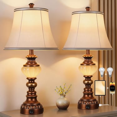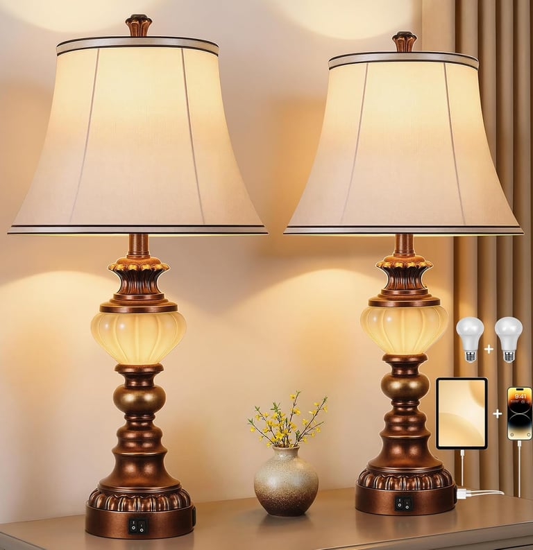 These table lamps come in a set of 2 and feature soft, silk-like shades that emit a warm glow. The overall design incorporates a vintage farmhouse style, exuding rustic elegance that harmonizes with various home décor options.