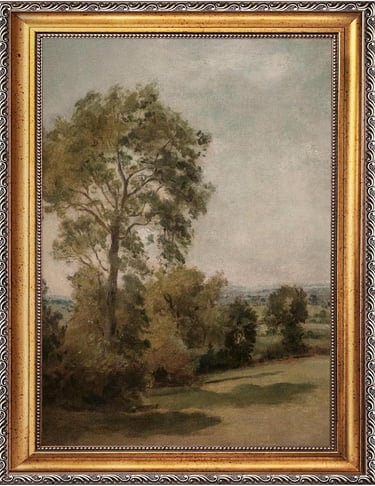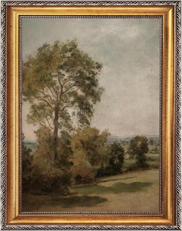Complement the Vintage European art piece with this vintage landscape art piece. This artwork depicts a tranquil countryside scene with tall trees and open fields, painted in a soft antique oil painting style. Gentle greens, warm browns, and atmospheric skies create a calming, pastoral mood that enhances any space with natural elegance