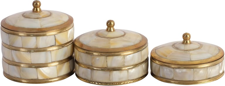 This set of 3 vintage hand-painted decorative jewelry boxes is a perfect way to combine function and art for your jewelry and trinkets. The antique metal case is constructed of brass and adorned with mother-of-pearl. The perfect addition to your dresser.