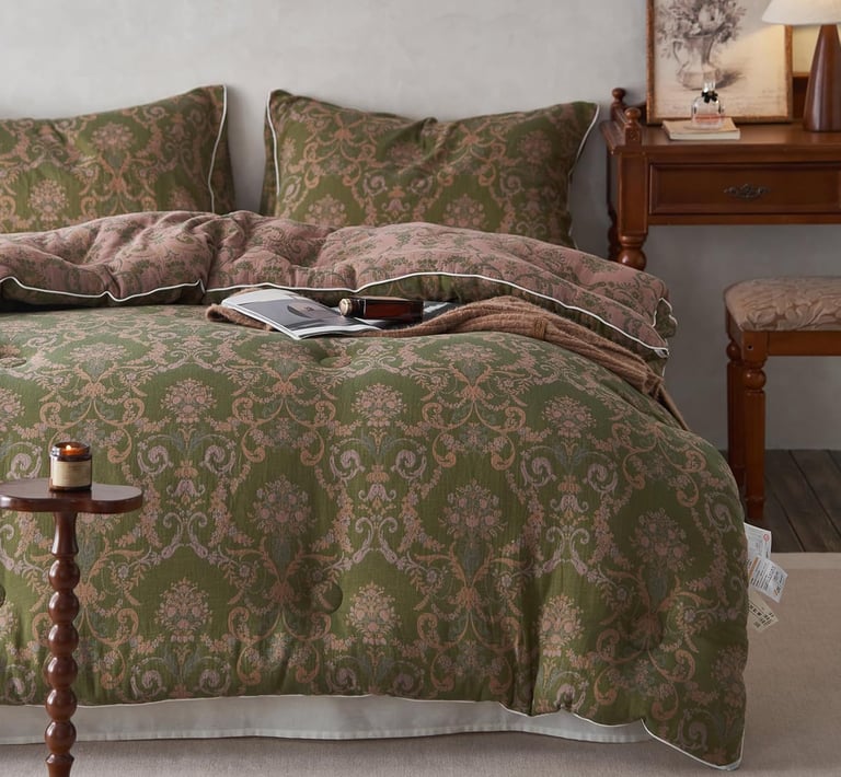 This olive green floral comforter features a delicate pattern in a unique muted palette. The vintage jacquard floral patterns add vitality and aesthetic vibe to your sleeping space.
